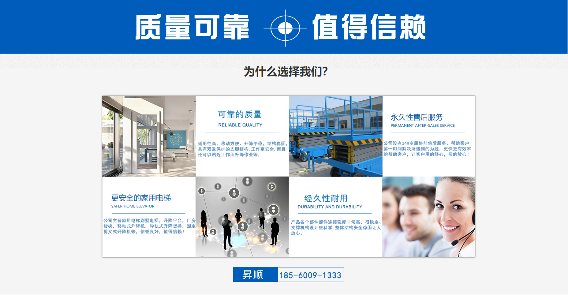 山東昇順液壓升降機械有限公司是一家主營家用電梯,別墅電梯,升降平臺,廠房貨梯,移動式升降機,導軌式升降貨梯,固定剪叉式升降機等產品企業,質量可靠,值得信賴。 用戶至上,以用戶為中心”是公司永遠堅持的服務宗旨,贏得用戶的贊許是我們的榮譽,及時滿足用戶的需求,是我們公司的愿望。長期以來,公司員工以優質的服務,取悅于用戶,以誠信的言行取信于用戶,得到了用戶們的好評。我們期待著與您更加愉快的合作!公司的發展,離不開社會的大力支持,在社會的支持和幫助下,我們正昂首闊步邁向未來! 我們的經營方針是:以質量求生存,以產品求發展,以信譽保合作,以服務贏客戶。 本公司對產品質量和各項服務恪守合同承諾,并愿與新老客戶精誠合作,共創未來。 公司精神:創新是主題,超越是不懈的追求?! 」咀谥迹盒抛u保證,誠信為本。 我們會以合理的價格,良好的信譽,雄厚的實力,優質的產品,最周到的服務,服務于廣大新老客戶!...